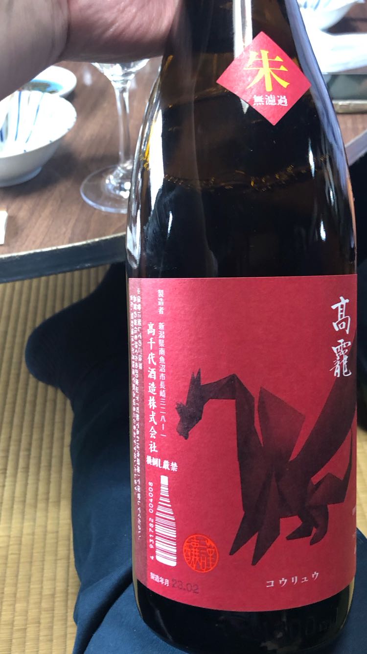 名称の由来は旧塩沢町にある「髙龗(たかおかみ)神社」から拝命した貴重な名前で、ラベルは「龍」で日本古来の技術「おりがみ」で表現しております。今回の「朱」は飲むほどに楽しく食事が進む酒。上立香は穏やかながら爽快なミント系。酸味も程よく柑橘系で柔らかな味わいとの事。