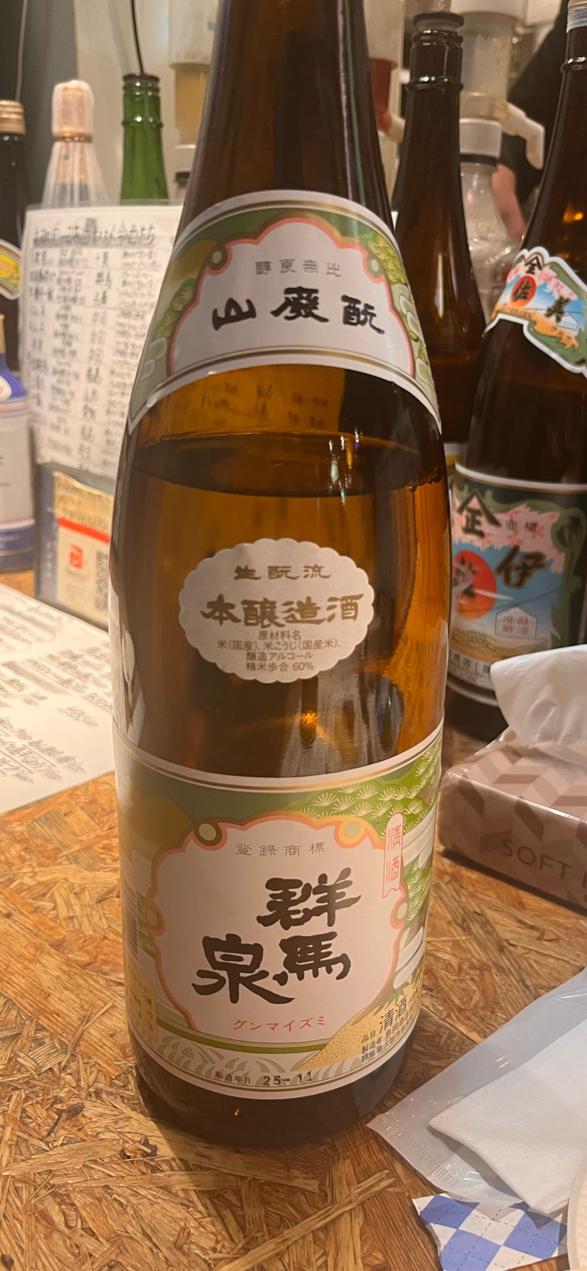 生酒の山廃はあまり見ないスペックで、大好きな群馬泉なので迷わず購入。ラベルもおしゃれで博多織のような模様。
