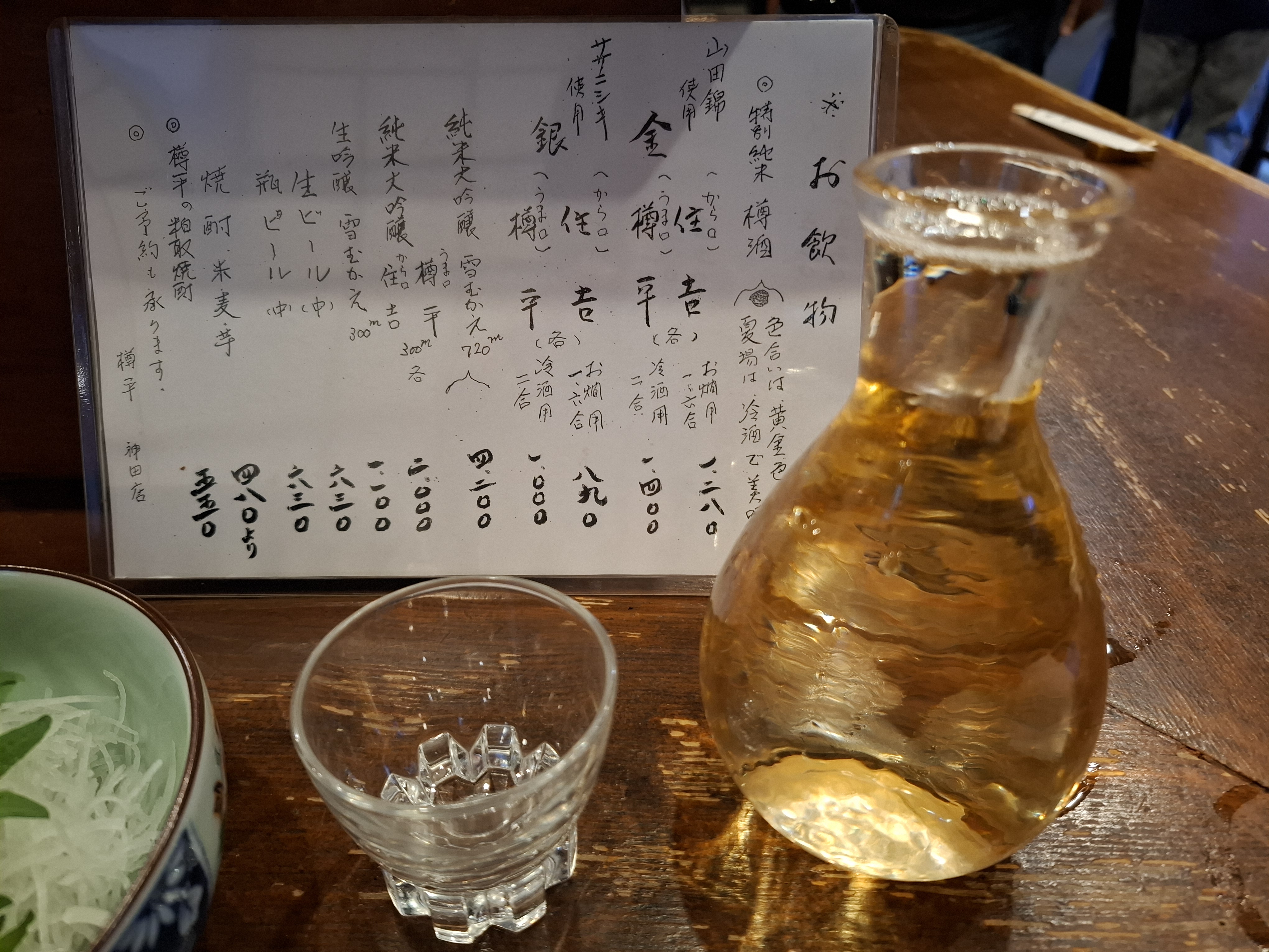 梅雨冷えの夜には辛口樽酒の燗酒が一番いい!口に含むと吉野杉のほのかな香りと米の芳醇な甘みが感じられ後でツーンと辛さがついてくる。癖になりそうです。