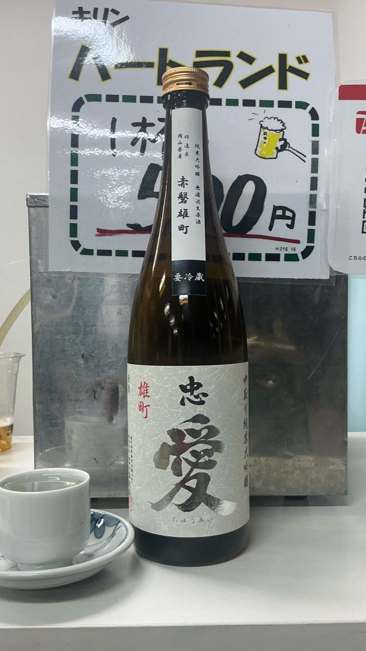 赤磐雄町100%使用した純米大吟醸。袋絞りして直ぐに瓶詰め・瓶燗火入れを行い、氷温熟成させた忠愛の超限定品