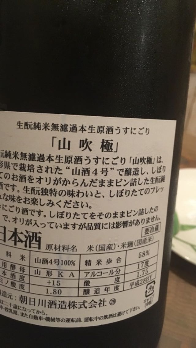 リンゴ少々な香り。骨格のある酸がしっかりした足取りでいらっしゃい。甘旨従えての苦。辛盛り上がりつつ早い切れ。舌ジワ余韻が、忘れられないお客だった若くキリッとした兵隊さんの様相。焼鳥塩、淡酸旨。白菜漬け、優甘旨。ウニつぶ貝、甘爽辛。塩辛、甘淡辛。ラベルで構えたけど、寄り添うアテ酒っすね!進めるほどに優しい爽山廃に。言うほど辛くないし、んまいっすわー。一週間後、味が馴染んですっきり辛口に。ここもいいっすねぇ。